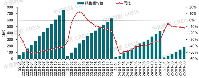 图:2022年至2025年1-6月TOP100房企累计发卖额均值及增速环境